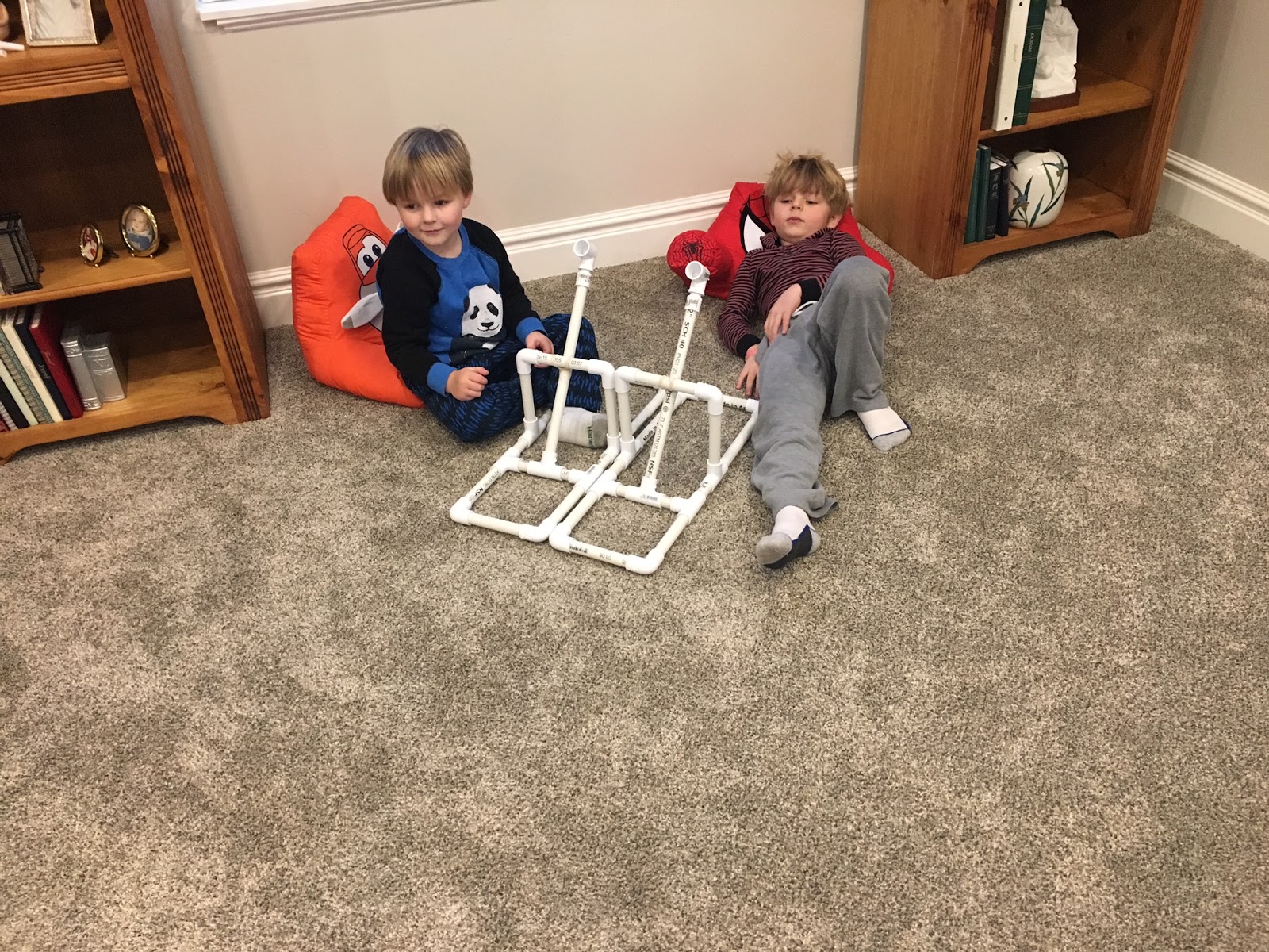 Mark found a cool design for a catapult. Grandpa helped cut the pipe and Mark and the boys put them together. Cash and
