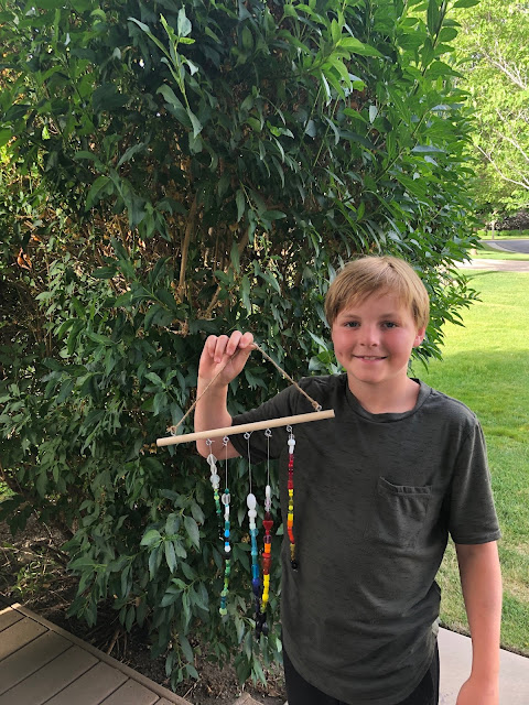 It was a hot, windy day yesterday so it seemed like a perfect day to make wind chimes with glass beads. We had fun making them and the chimes look so good hanging in the trees.
